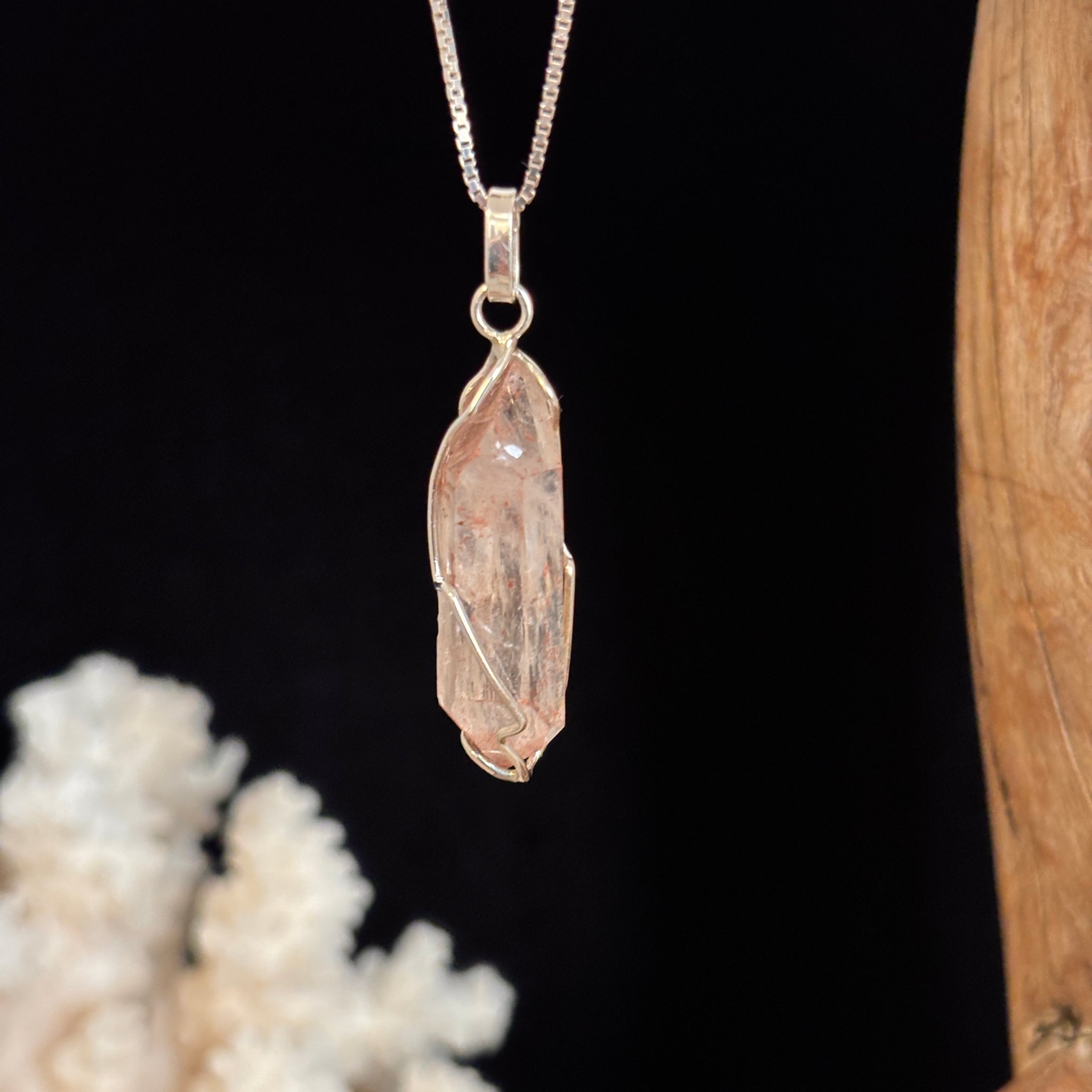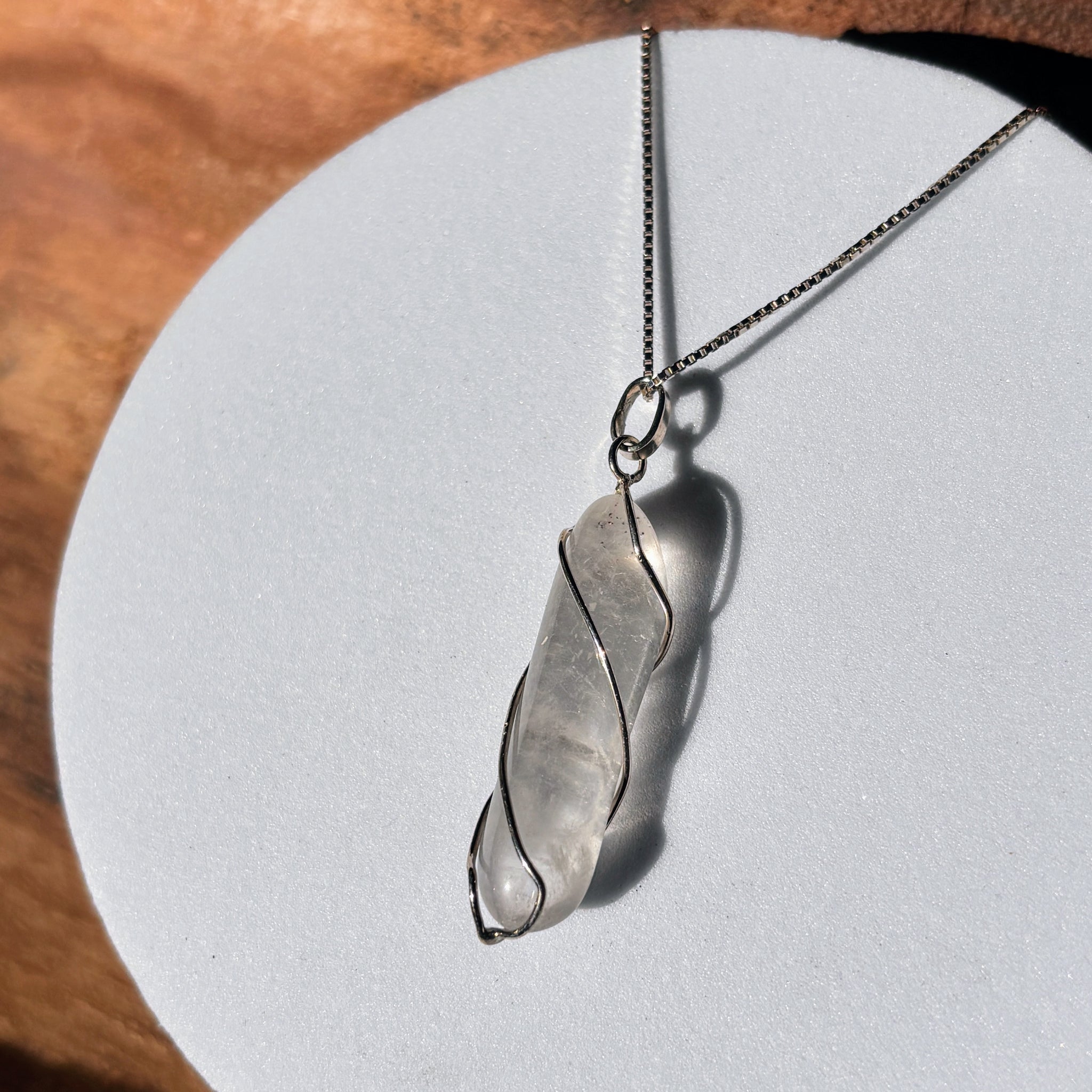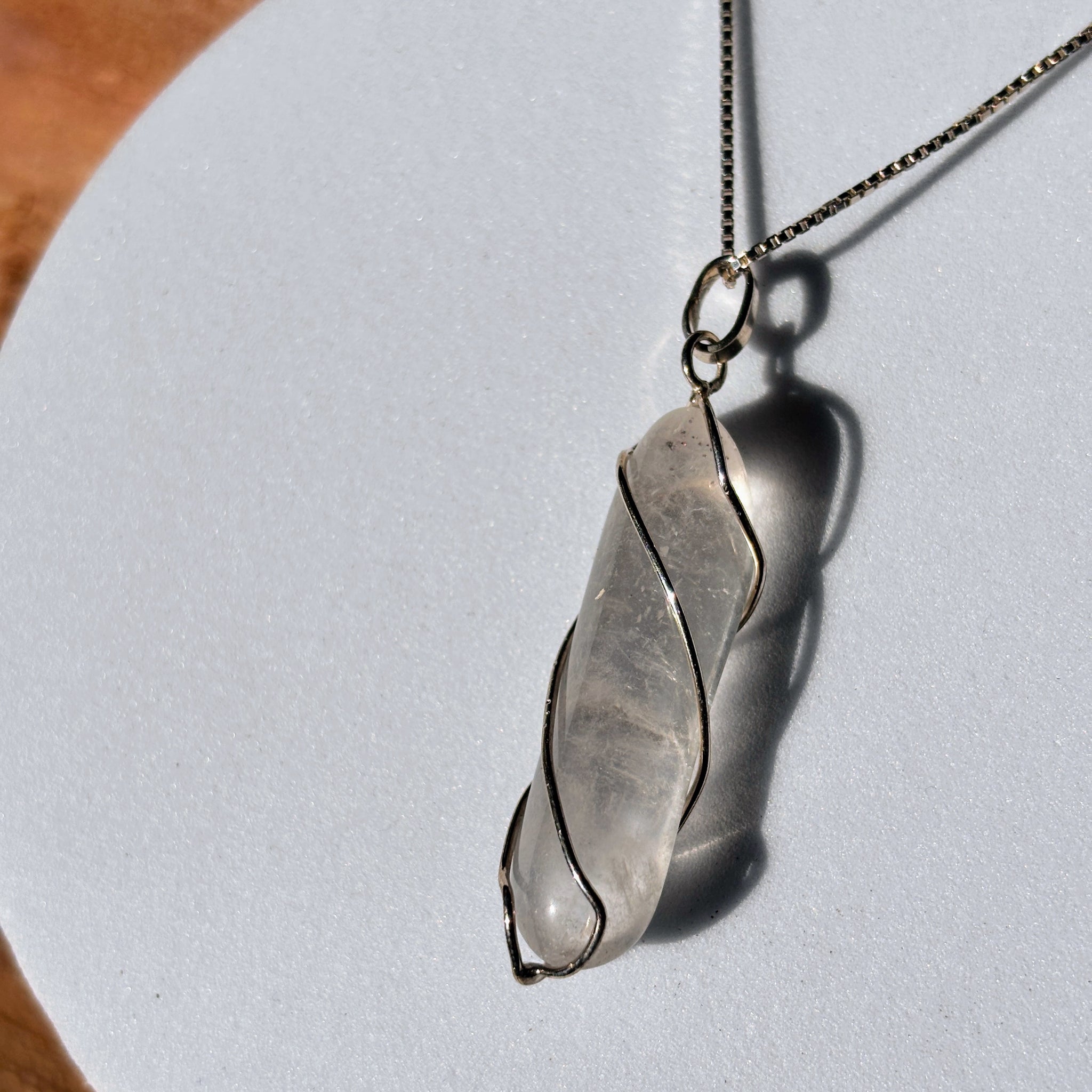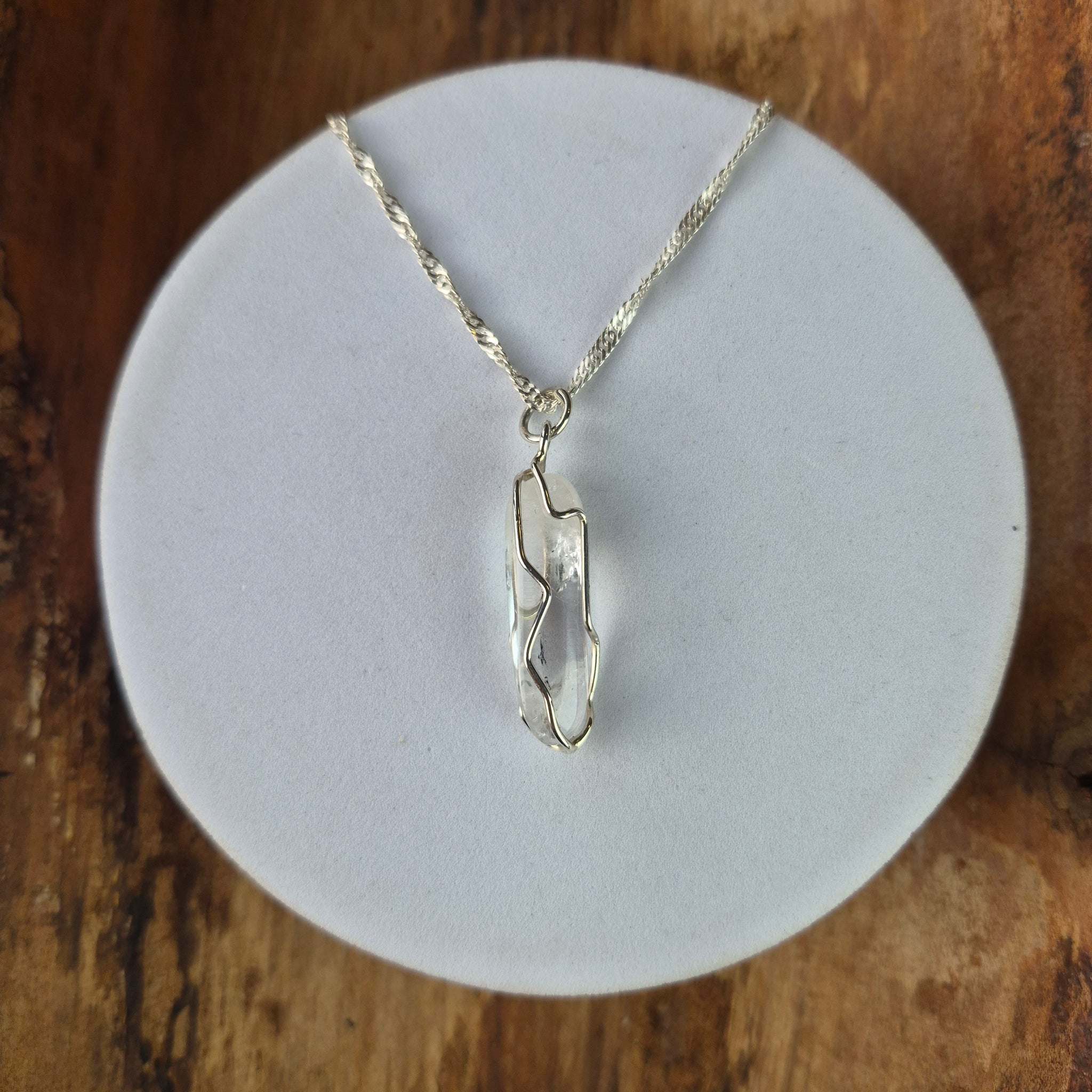 Pendentif de Cristal de quartz polis du Québec no.112 Le cristal est extrait de la mine du Lac-Saint-Jean par un prospecteur-cristallier Le fil d’argent soudé met en évidence la...