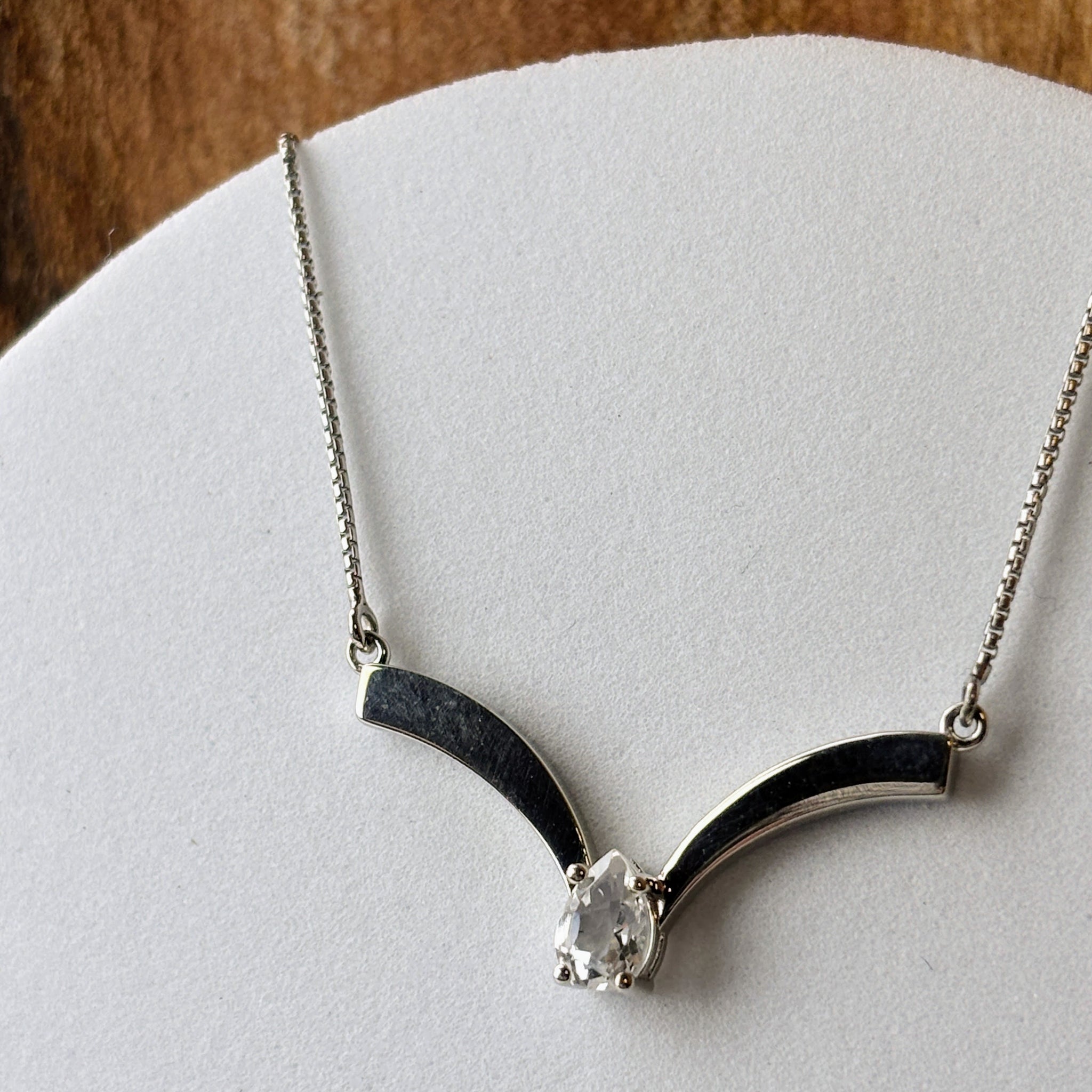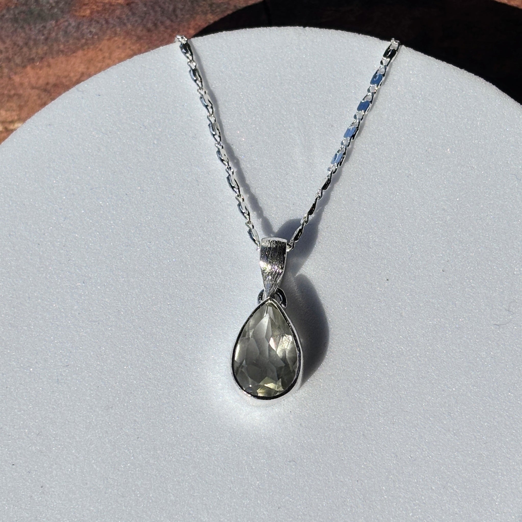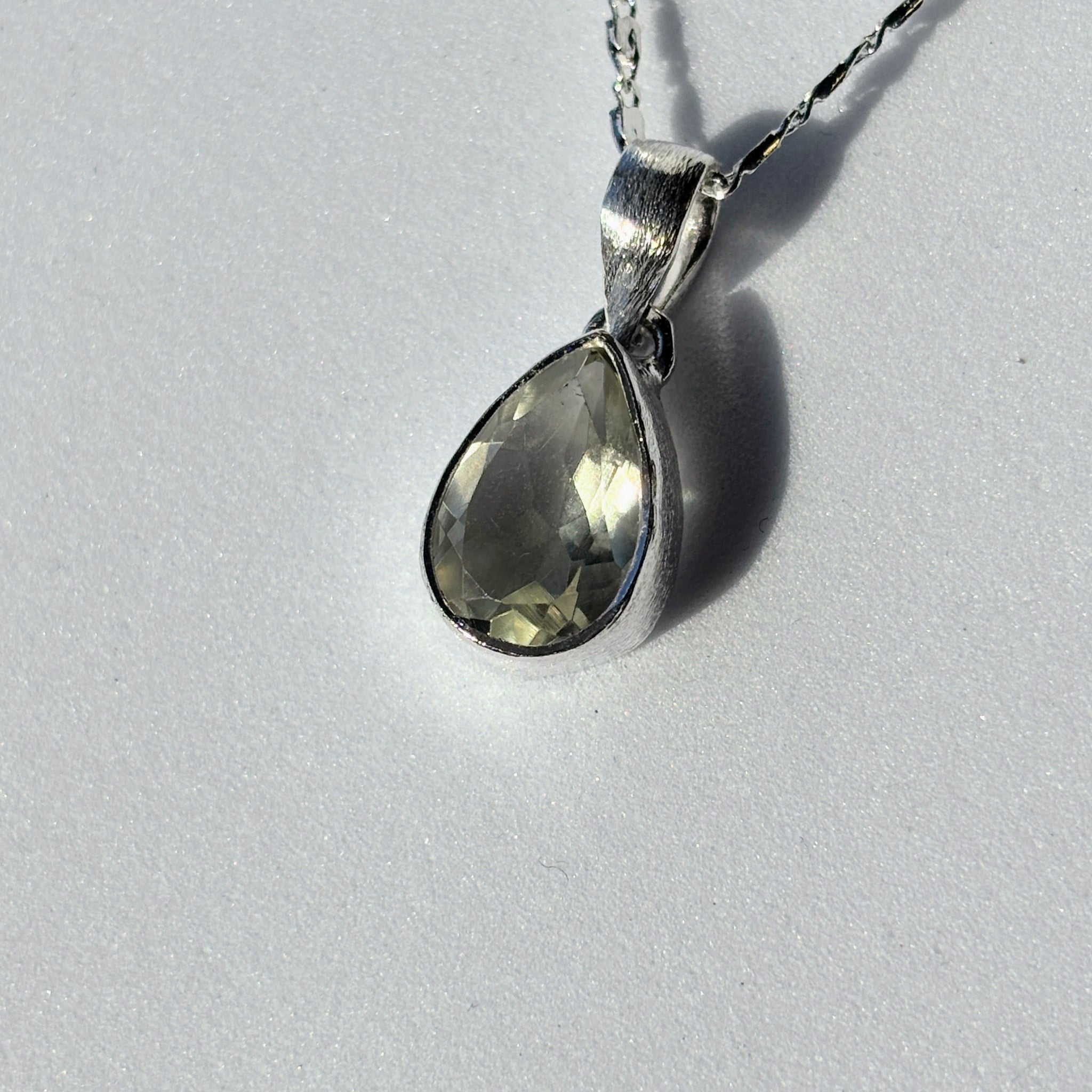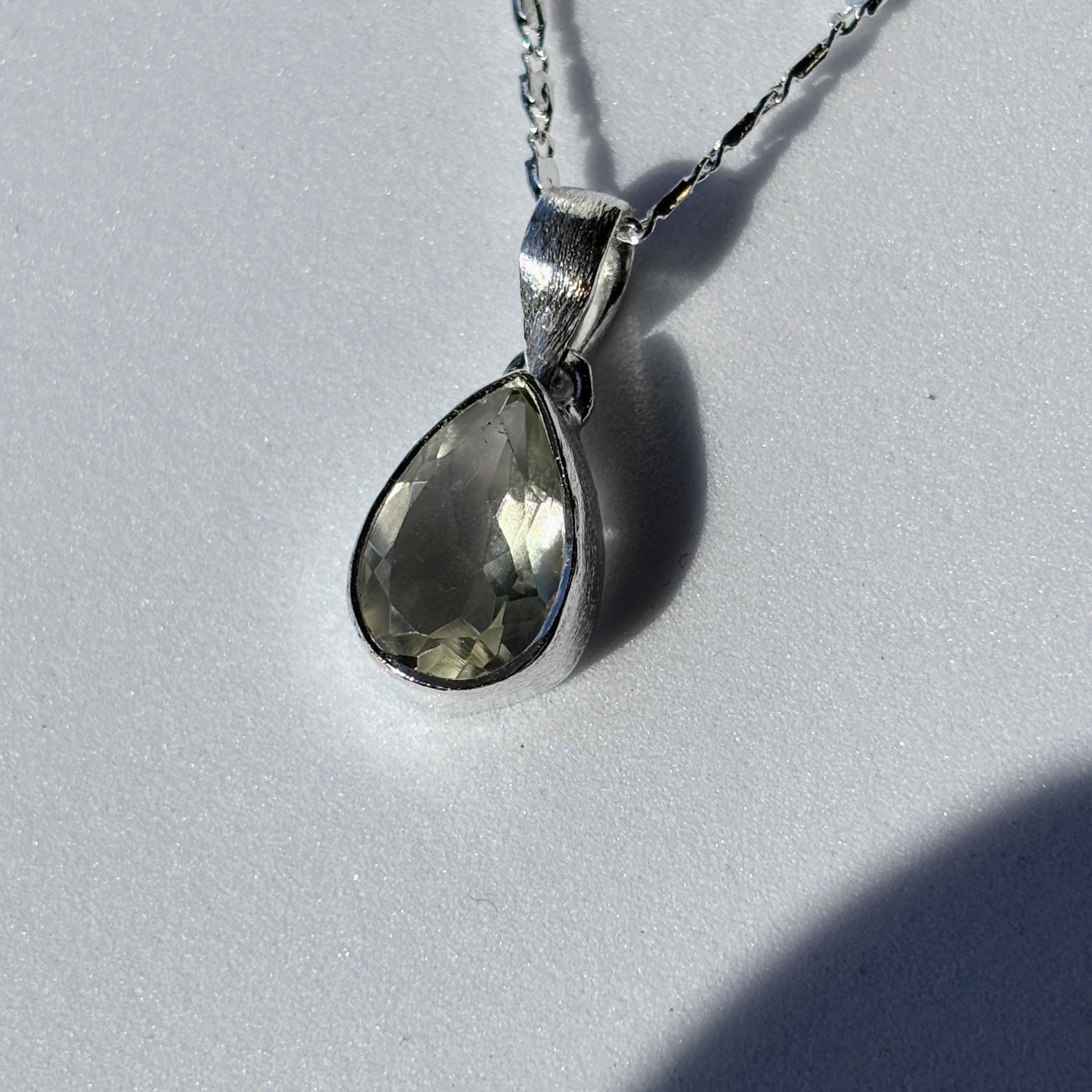 Pendentif de Cristal de quartz polis du Québec no.112 Le cristal est extrait de la mine du Lac-Saint-Jean par un prospecteur-cristallier Le fil d’argent soudé met en évidence la...