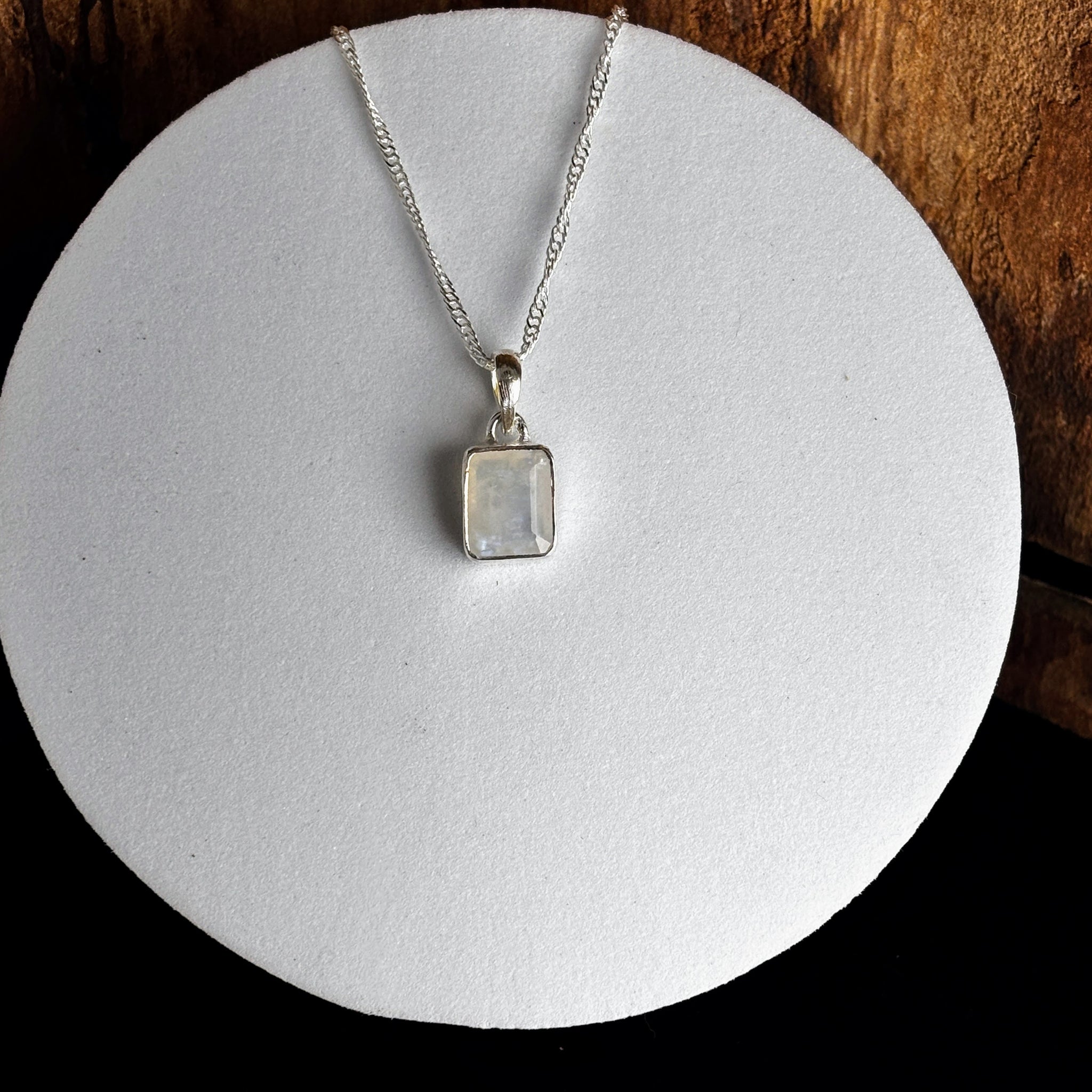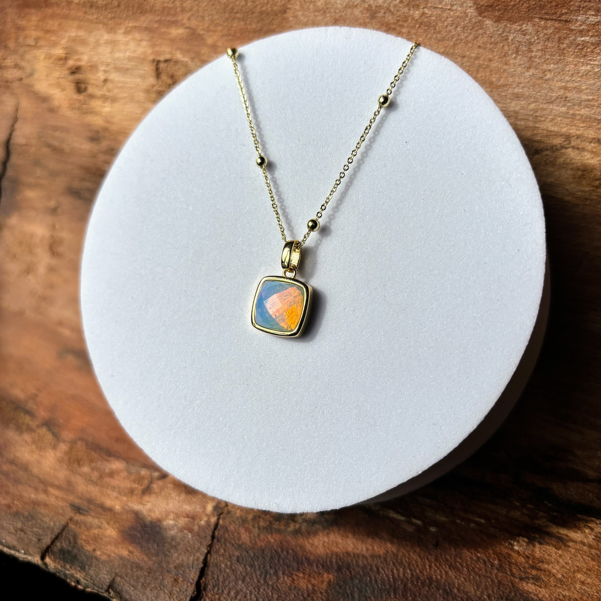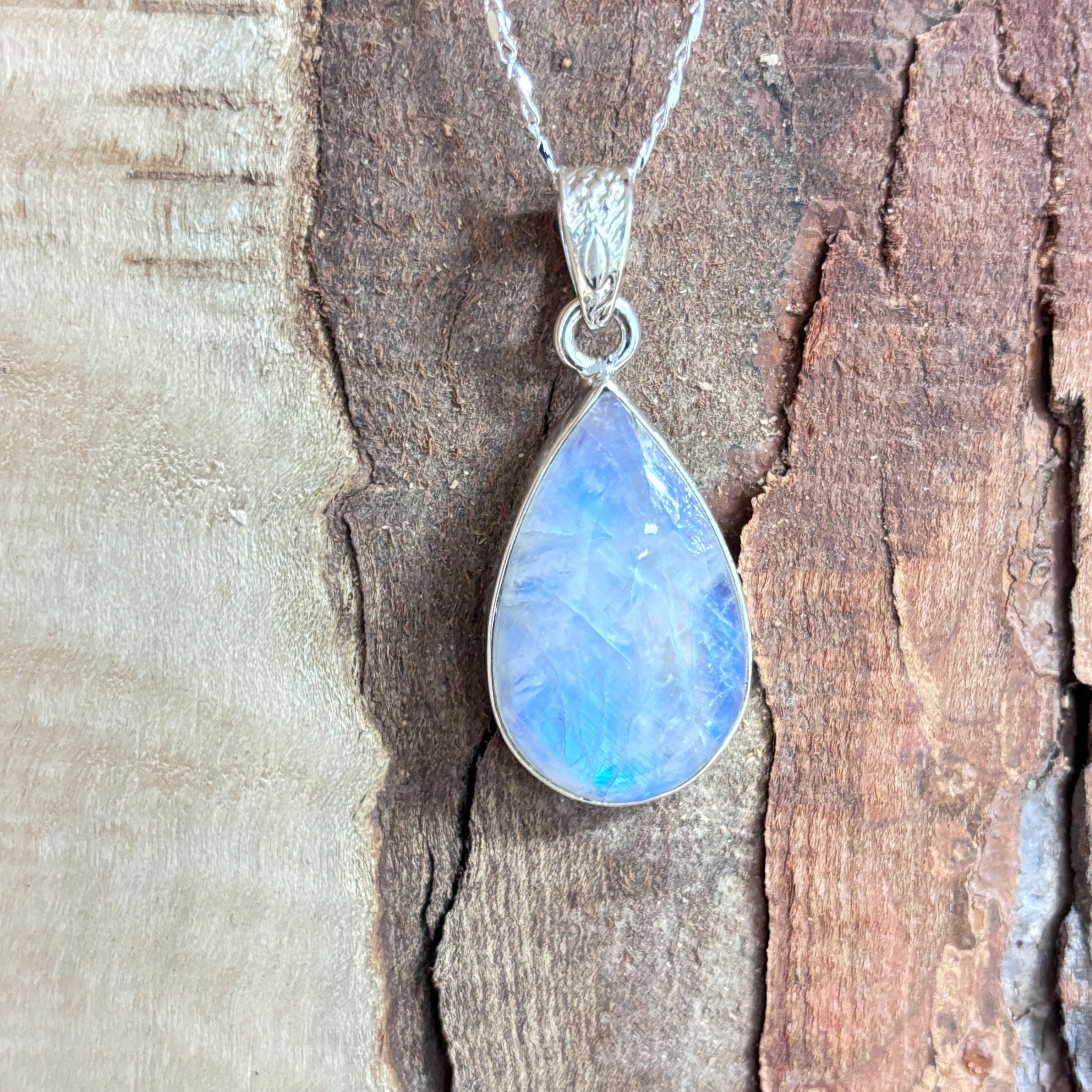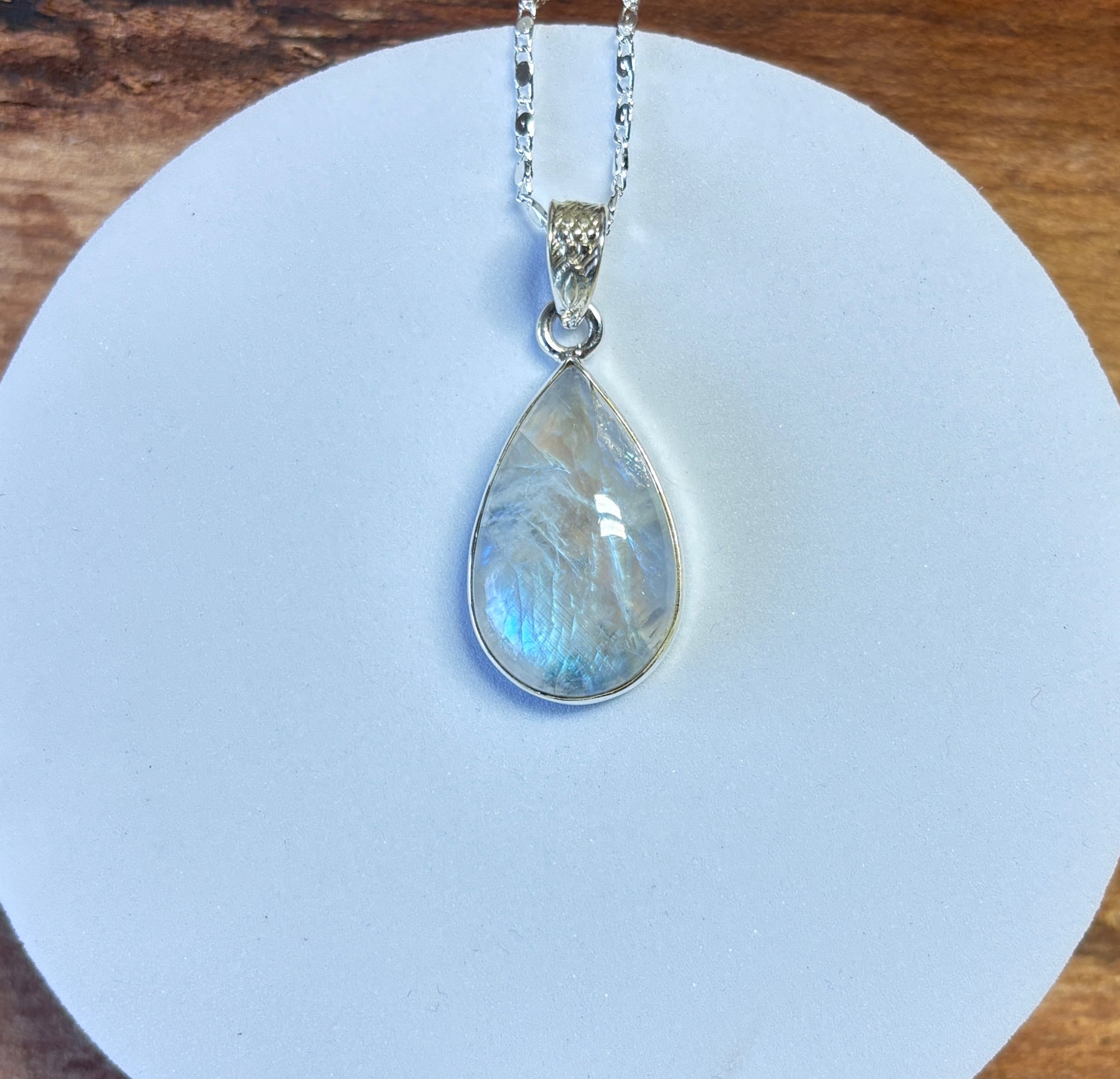 Pendentif pierre de Lune La pierre de lune, scientifiquement appelée orthoclase ou hécatolite, fait partie de la famille des Feldspaths Elle a une teinte transparente à blanche, jusqu’à des reflets...