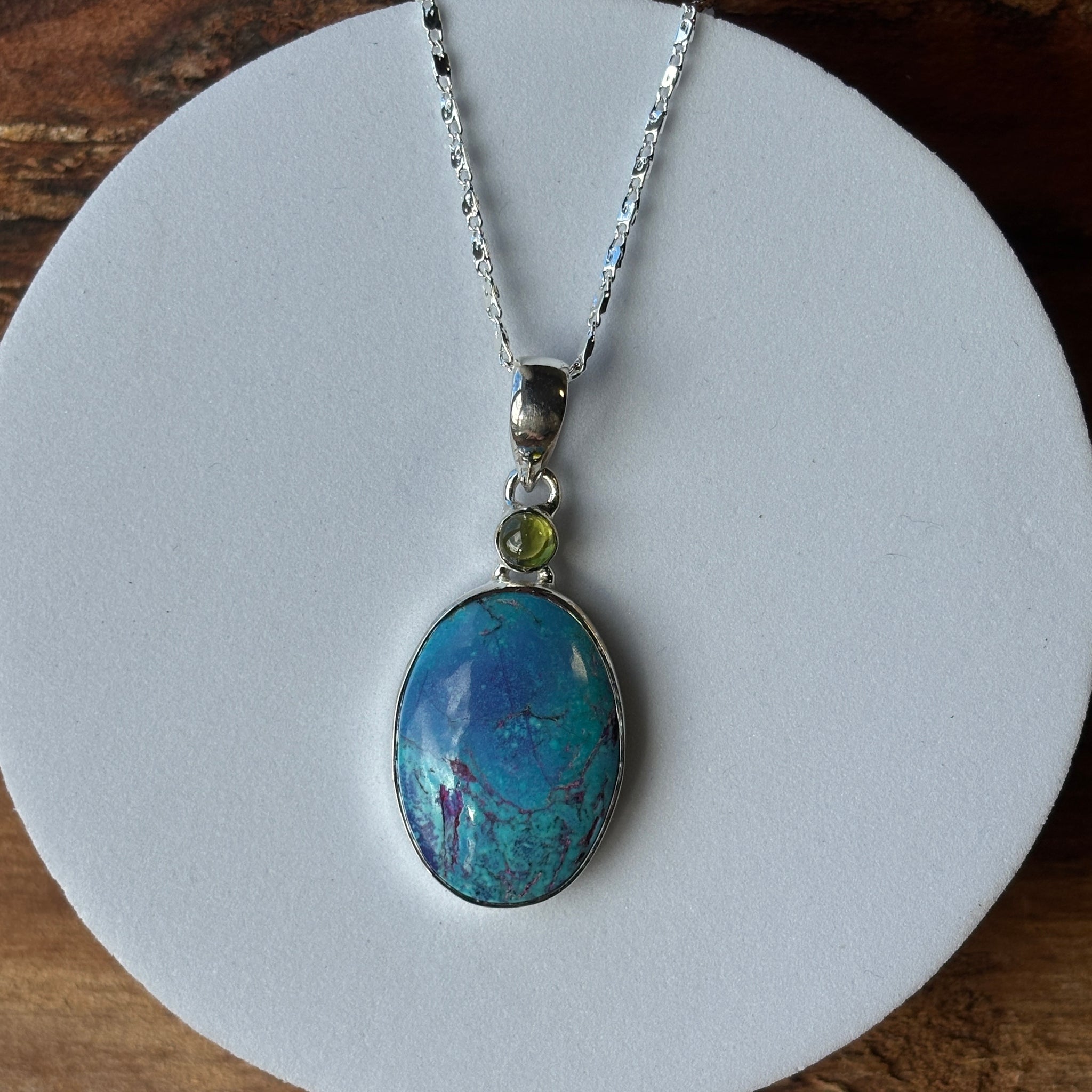 Pendentif pierre Shattuckite et Péridot Shattuckite: Minéral rare qui ce forme dans les zones désertiques, souvent confondu avec de la chrysocolle. La couleur naturelle de ce bijoux en argent 925 lui...