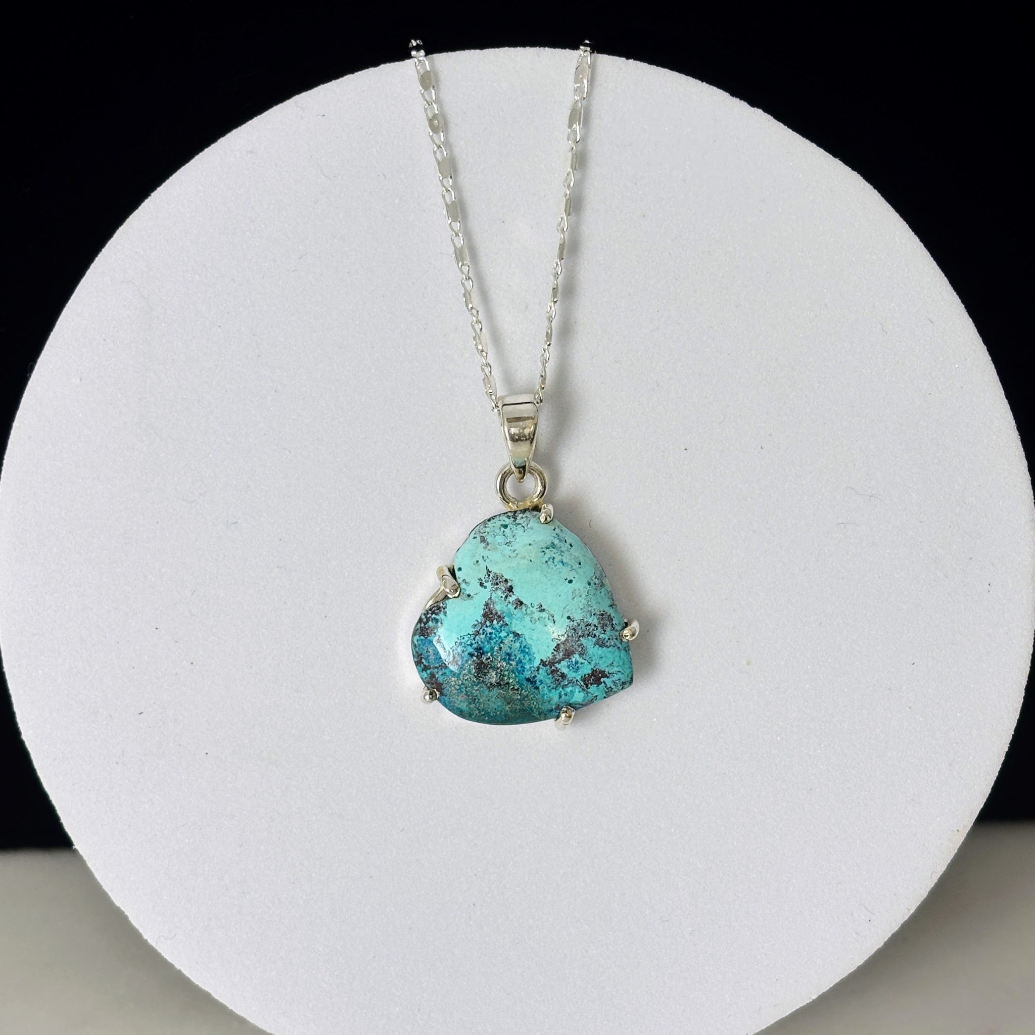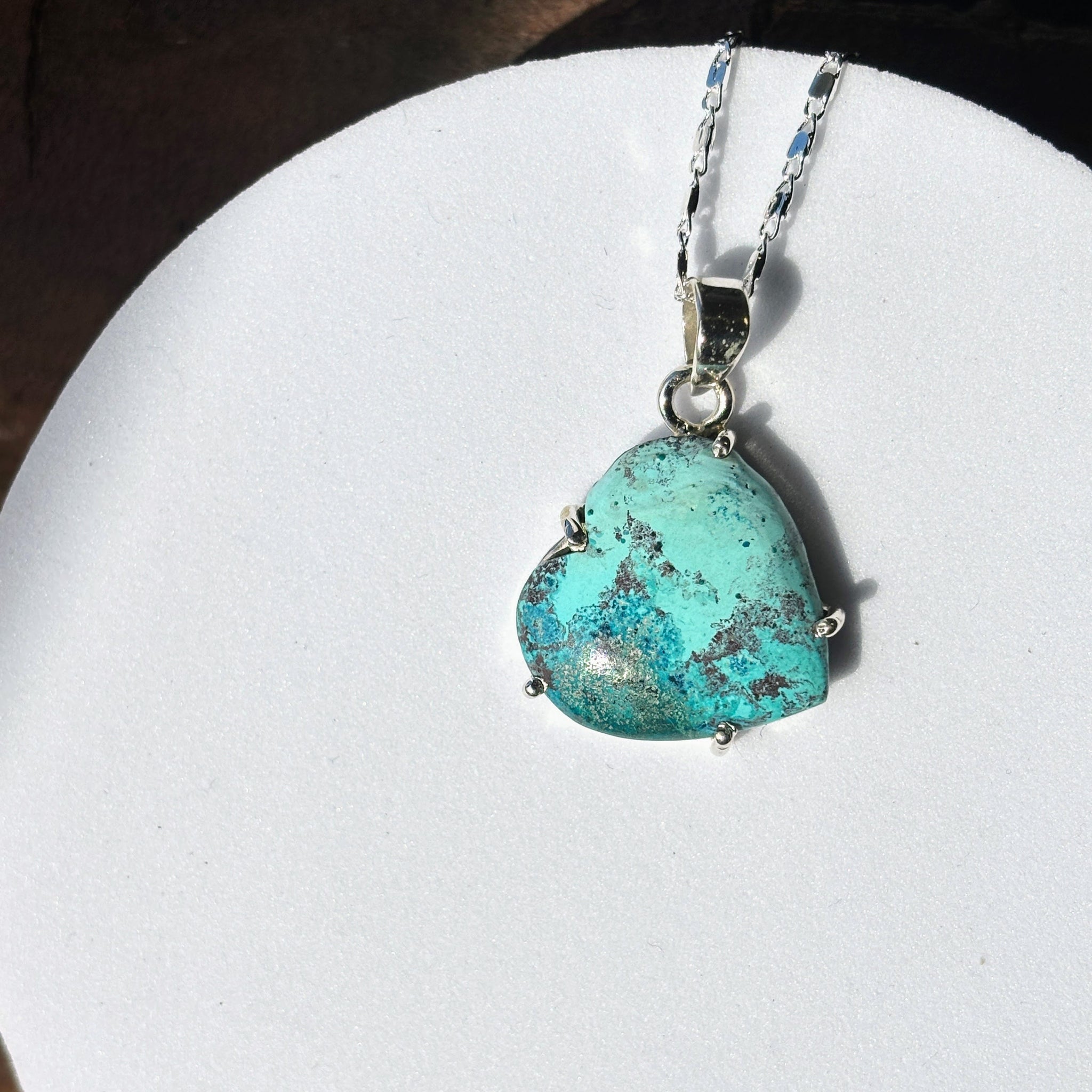 Pendentif pierre Shattuckite Minéral rare qui ce forme dans les zones désertiques, souvent confondu avec de la chrysocolle La couleur naturelle de ce bijoux en argent 925 lui donne un éclat...