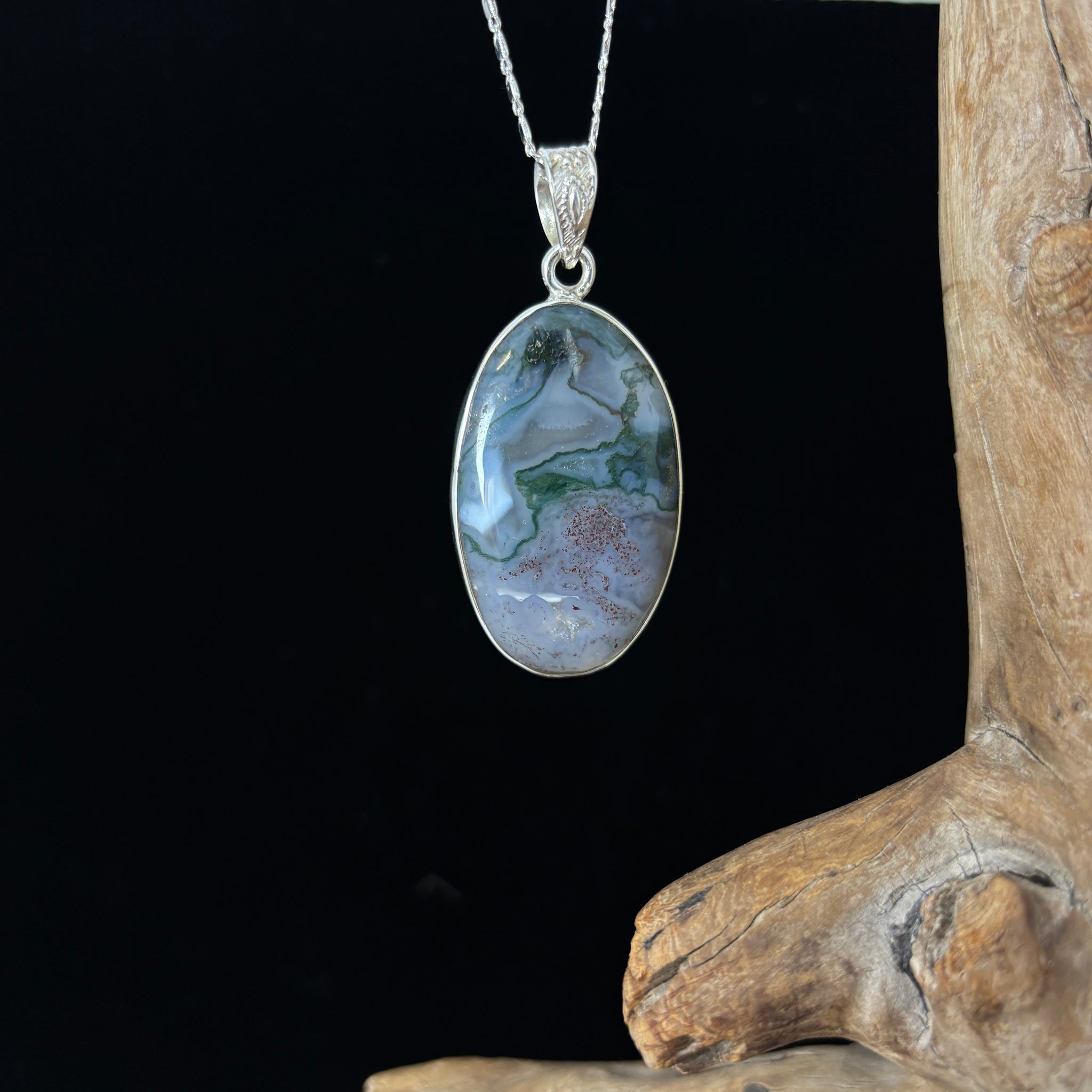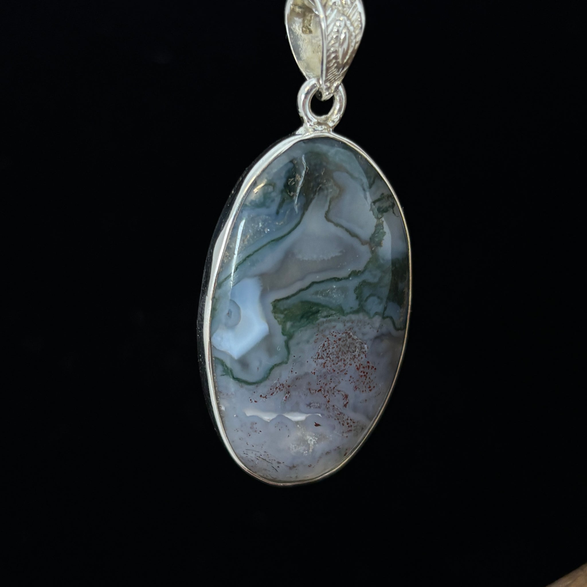 Pendentif Agate Mousse L’agate mousse est une variété de calcédoine, formée principalement de dioxyde de silicium (SiO₂), dont les inclusions minérales évoquent des motifs végétaux. Ces structures naturelles, souvent dues...