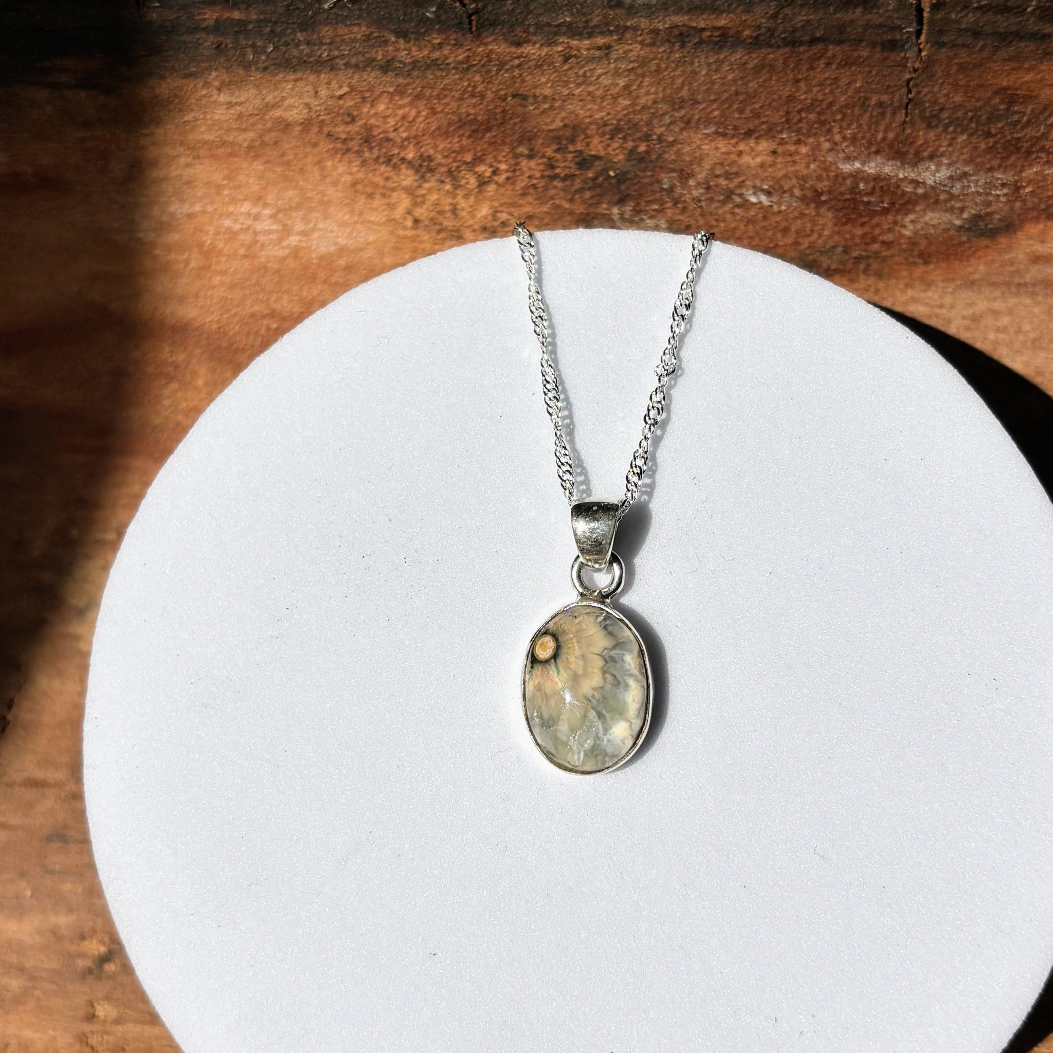 Découvrez la beauté naturelle et subtile de ce Bijou d' Agate Scénique. Cette variété de Calcédoine nous permet de voir les magnifiques dessins naturels qui évoquent des paysages. Légèrement...