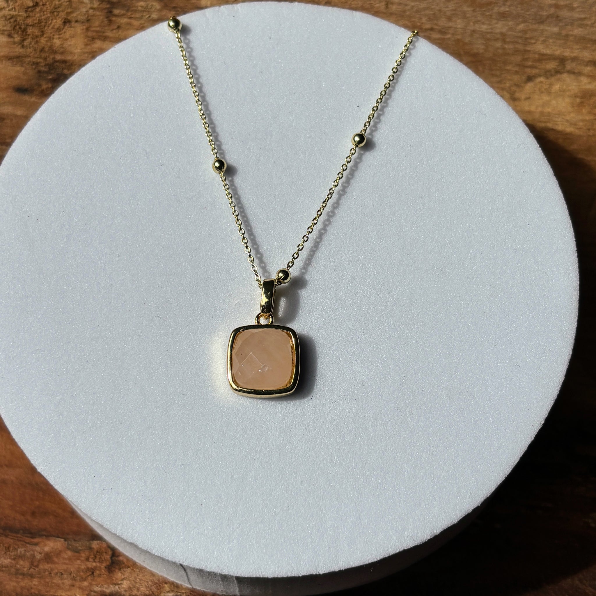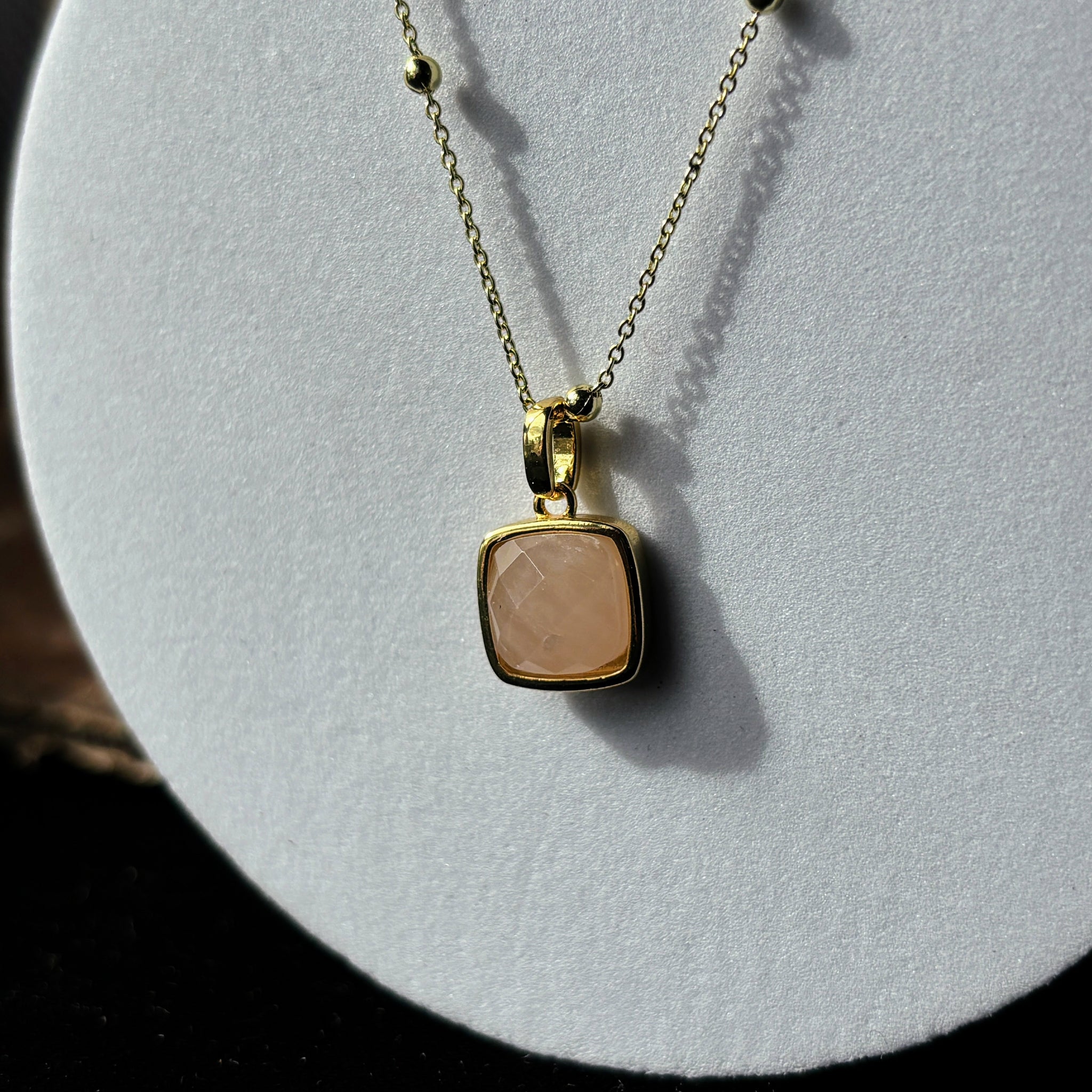 Pendentif Quartz rose facetté Carré Le quartz rose est une variété de quartz dont la teinte rose est due au titane et à la manganèse. La teinte peut être plus...
