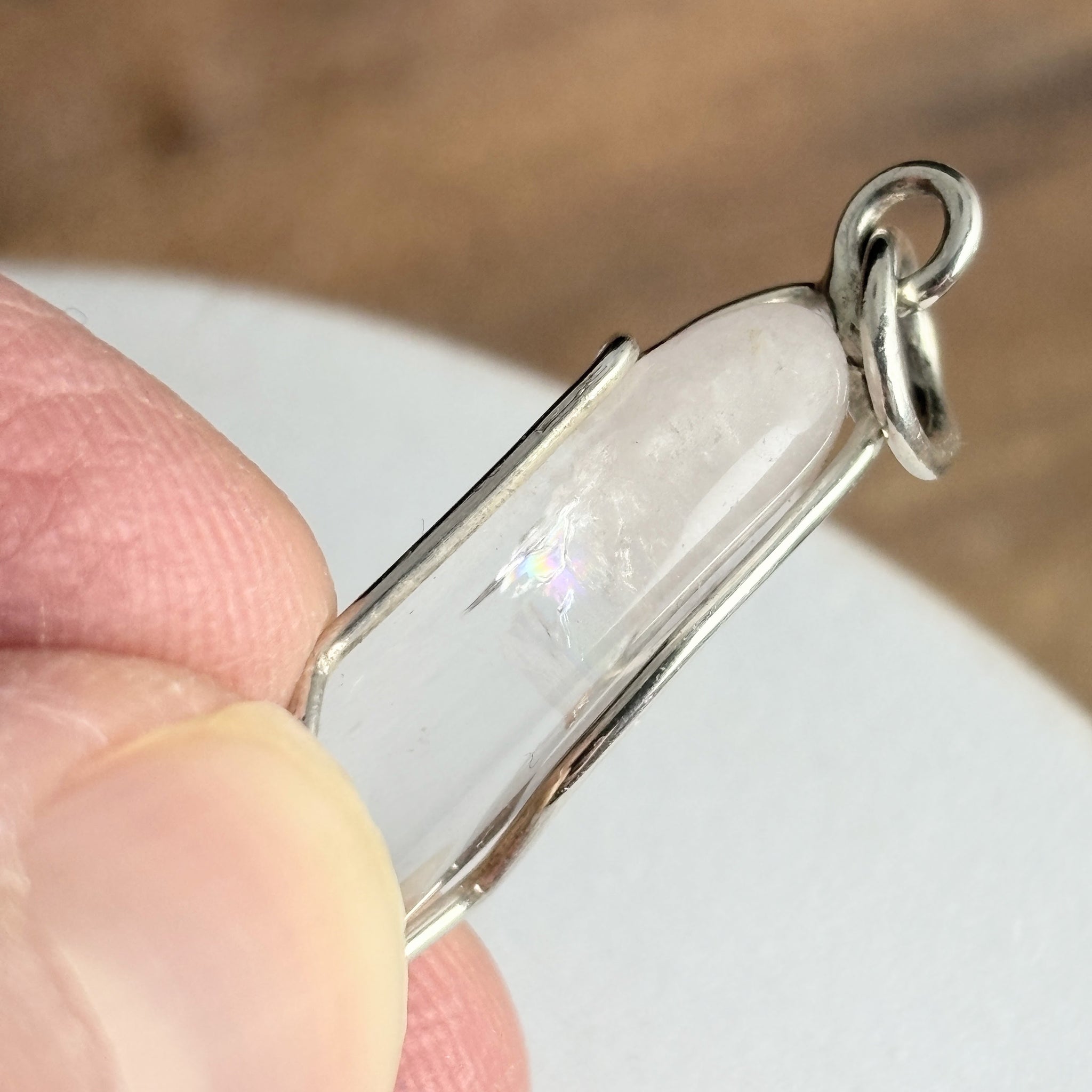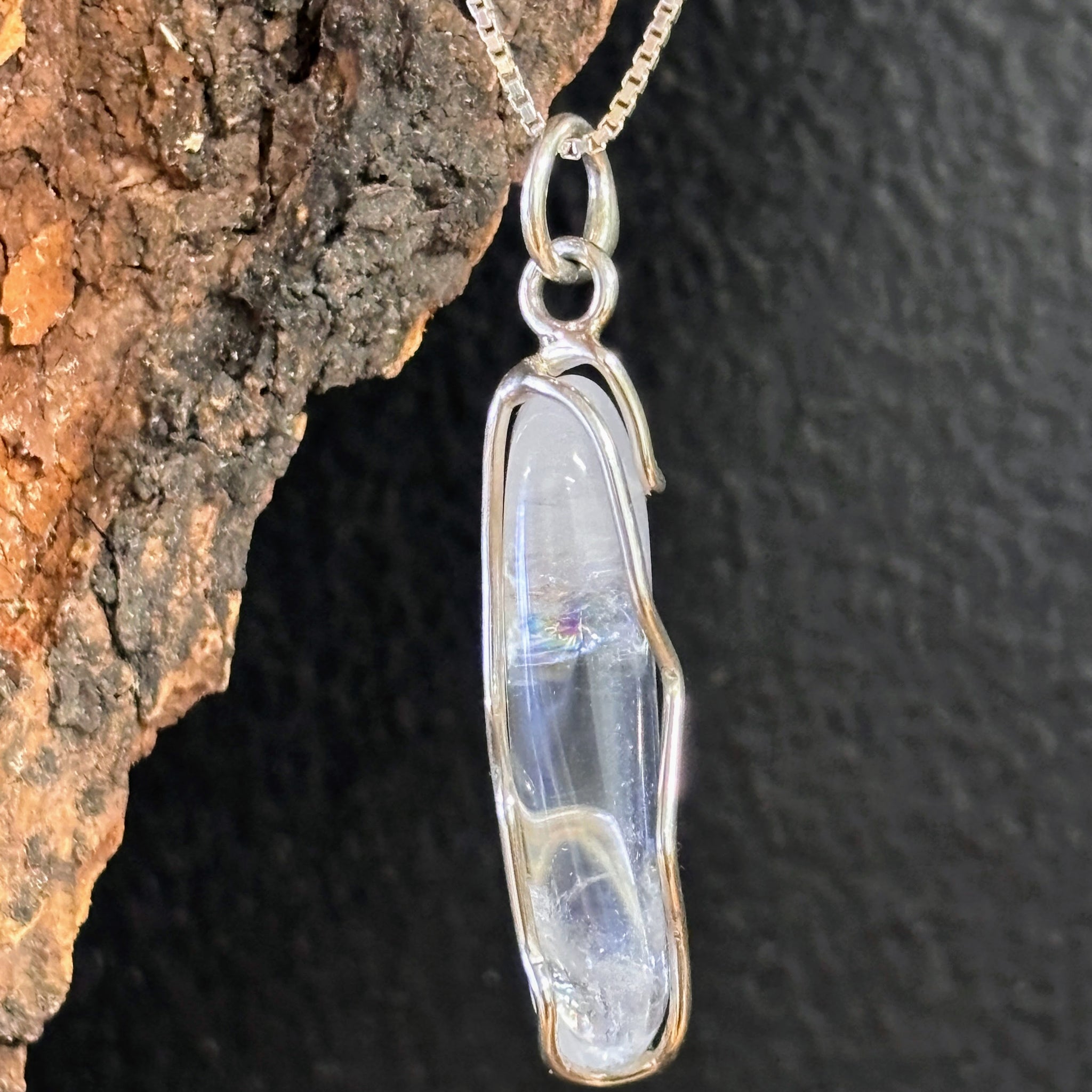 Pendentif de Cristal de quartz polis du Québec no. 76 Bijou de cristal de quartz poli avec arc en ciel , à l’état naturel, entouré d’un fil d’argent 925....