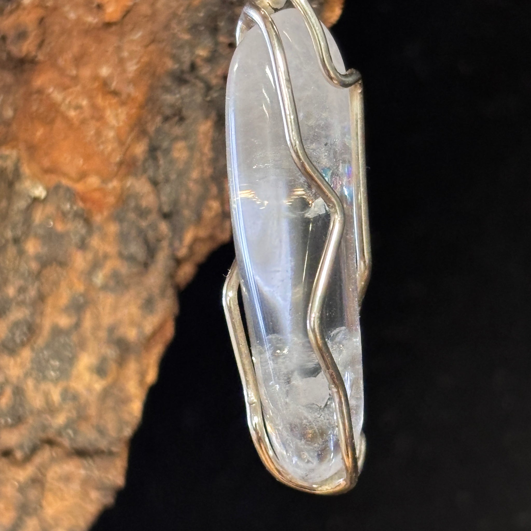Pendentif de Cristal de quartz polis du Québec no. 75 Bijou de cristal de quartz poli avec arc en ciel , à l’état naturel, entouré d’un fil d’argent 925....