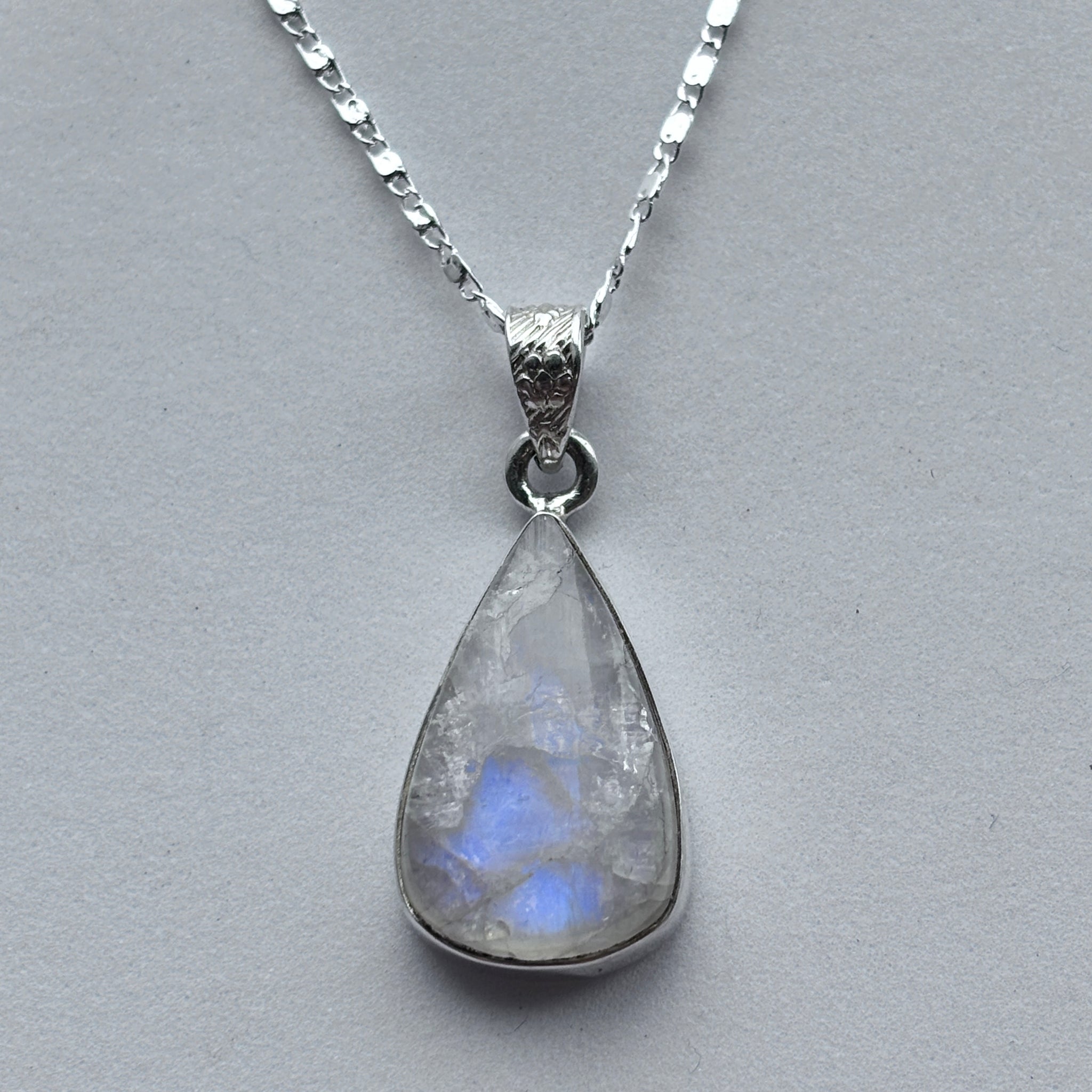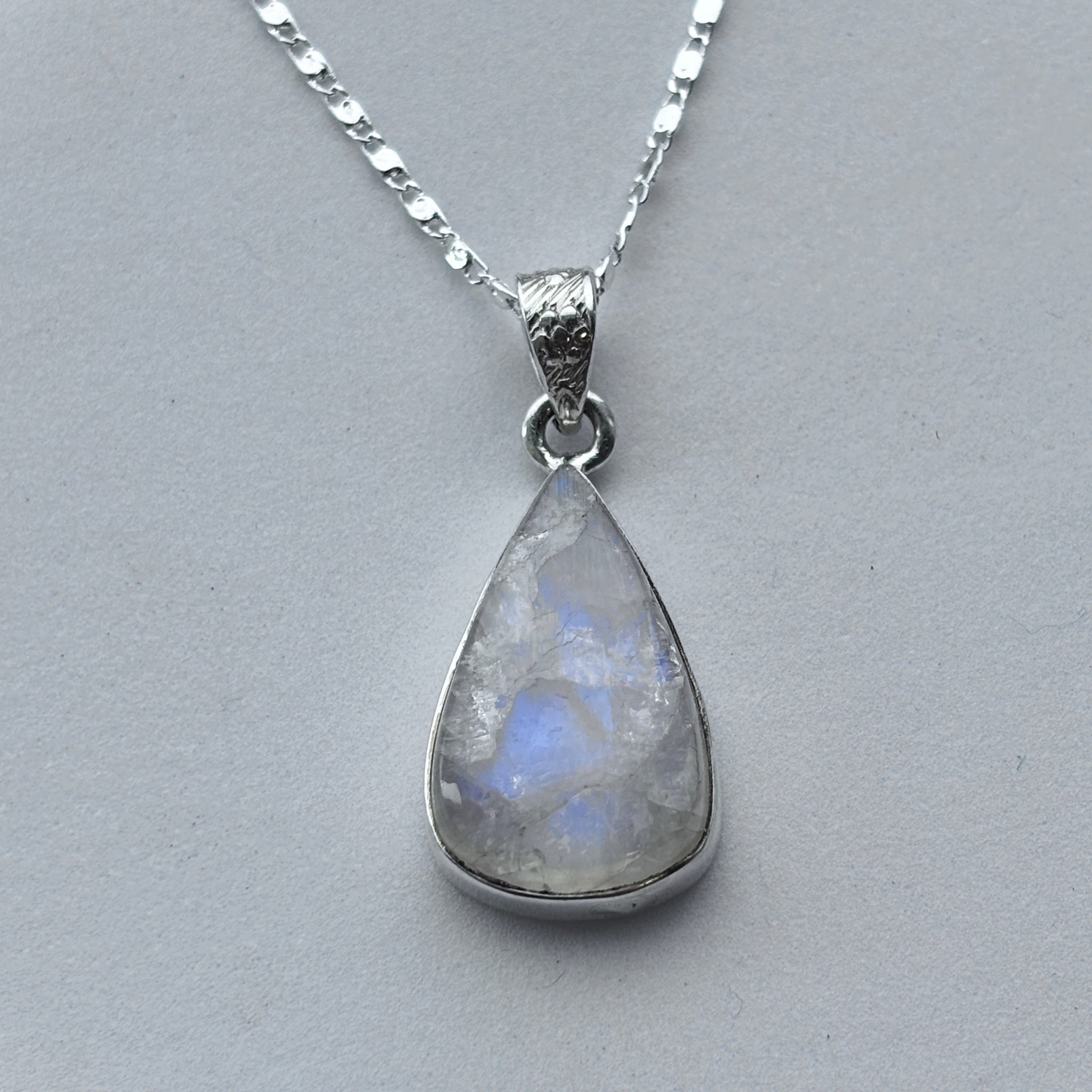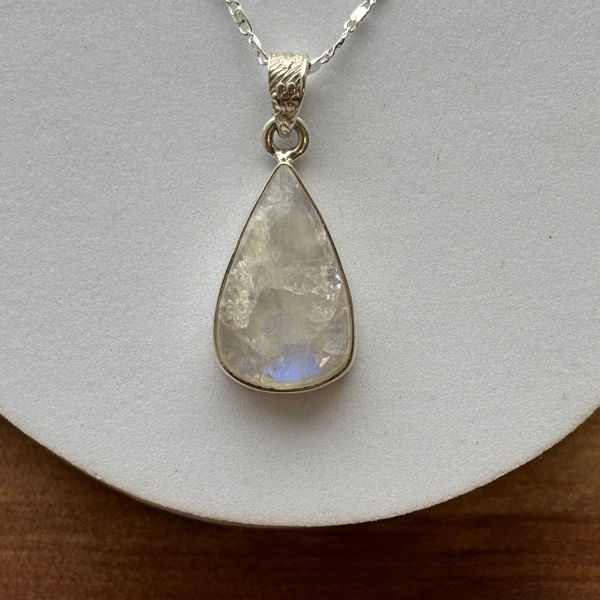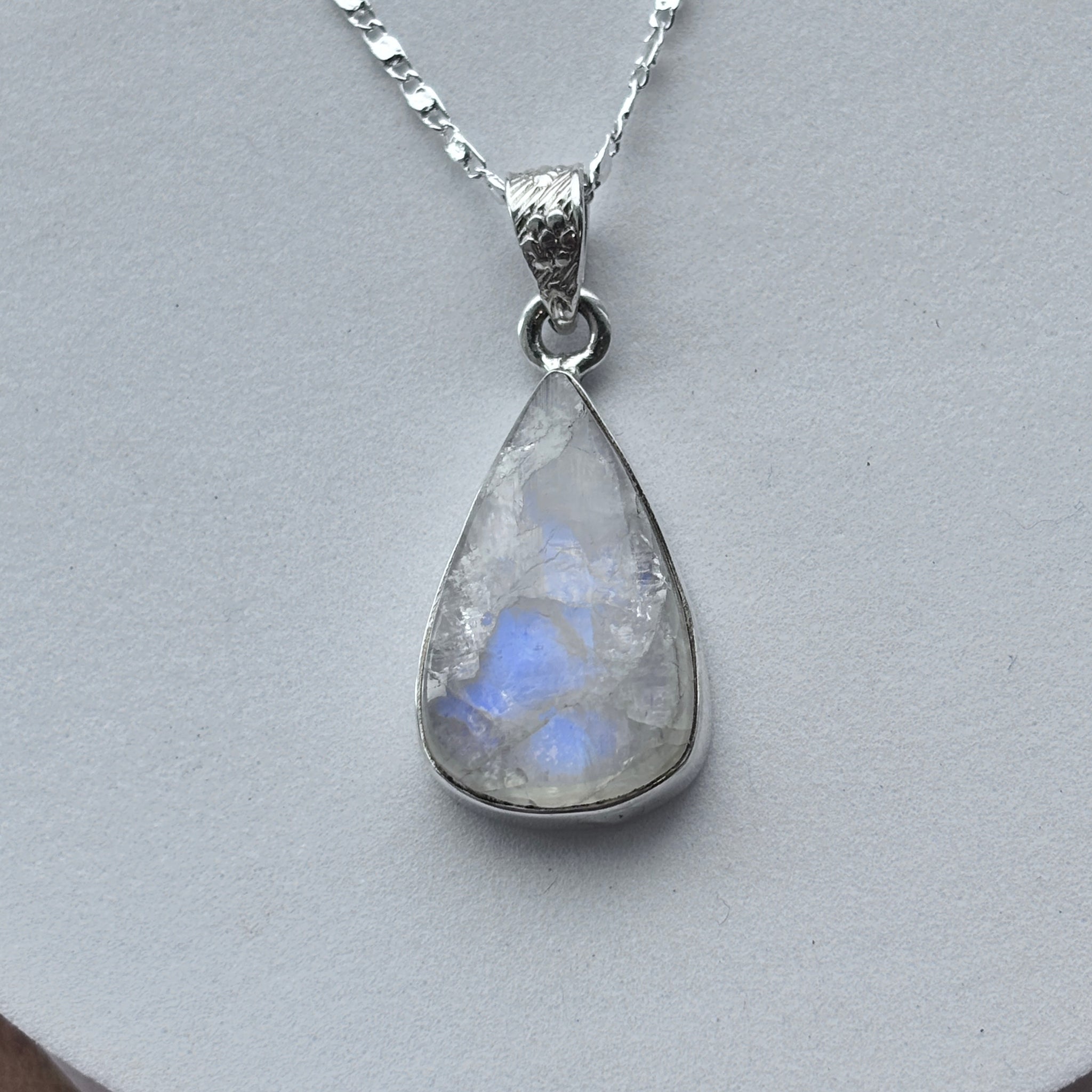 Pendentif pierre de Lune La pierre de lune, scientifiquement appelée orthoclase ou hécatolite, fait partie de la famille des Feldspaths Elle a une teinte transparente à blanche, jusqu’à des reflets...