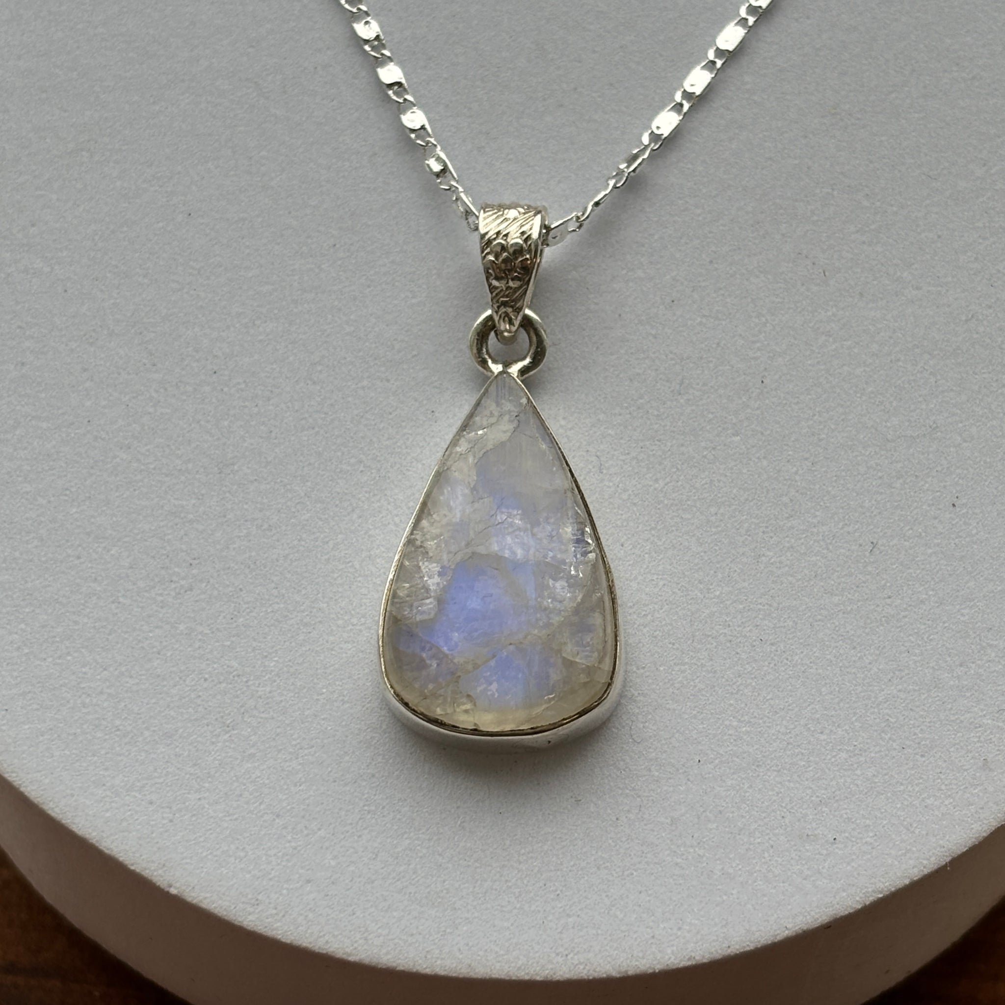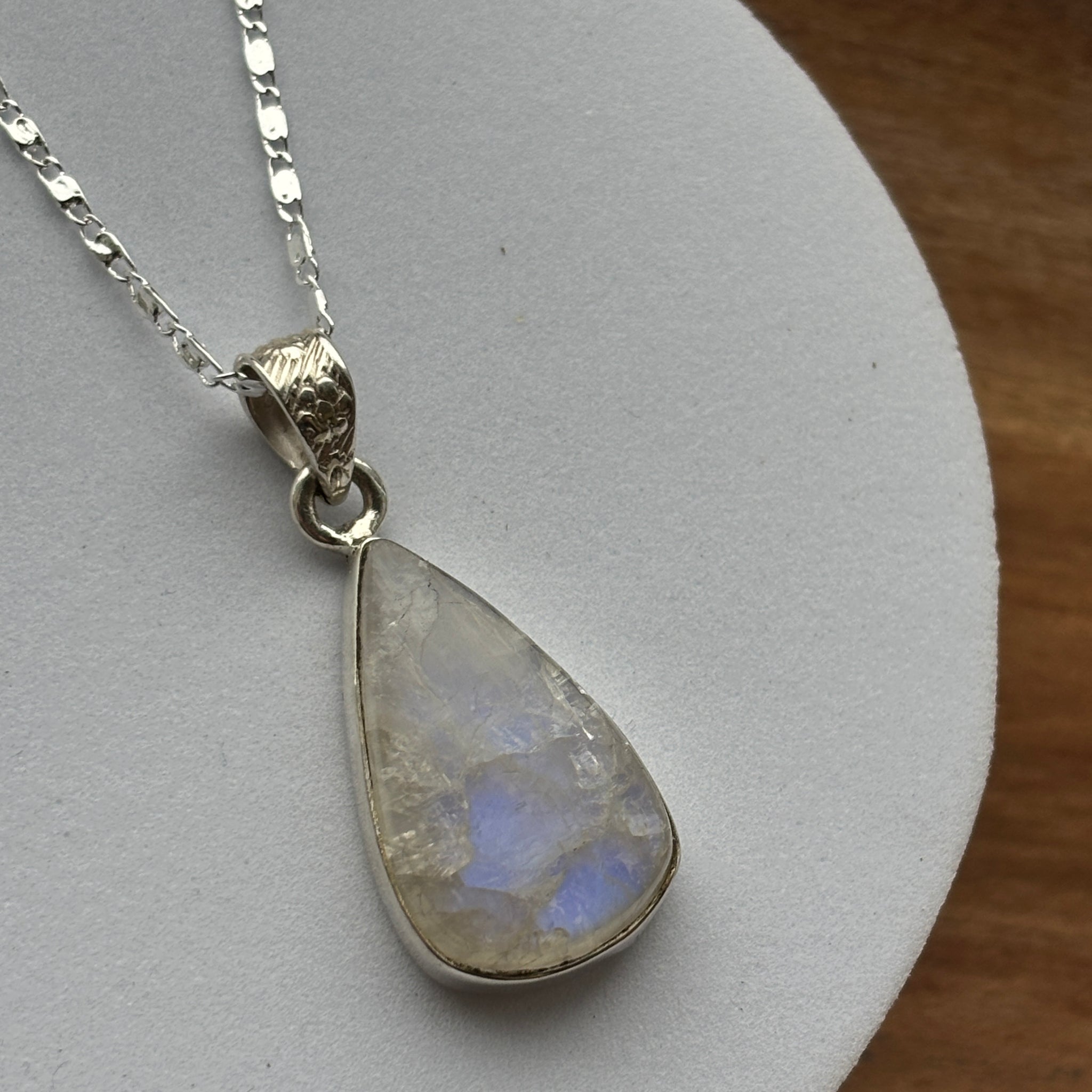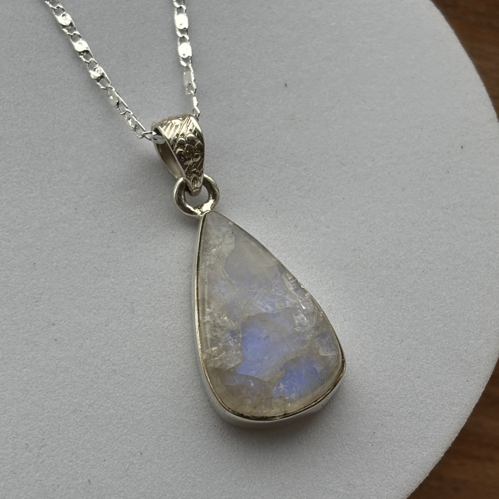 Pendentif pierre de Lune La pierre de lune, scientifiquement appelée orthoclase ou hécatolite, fait partie de la famille des Feldspaths Elle a une teinte transparente à blanche, jusqu’à des reflets...