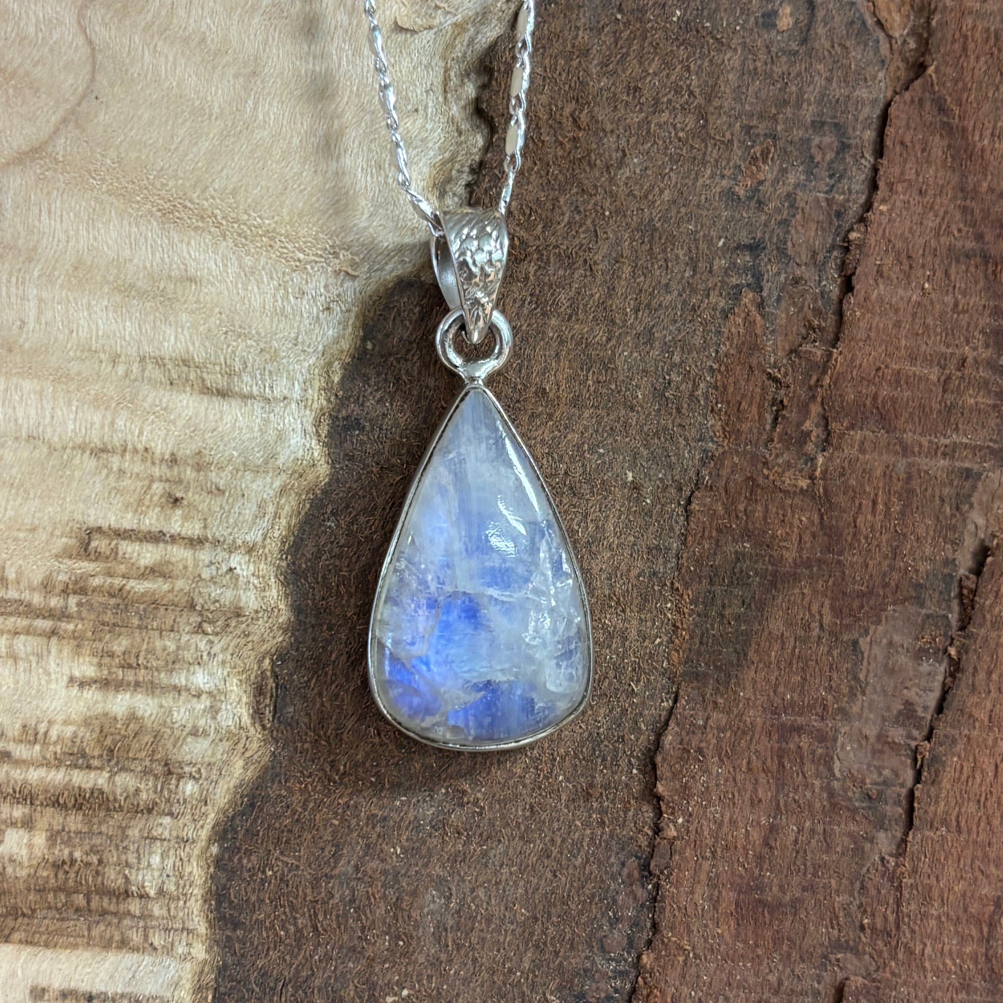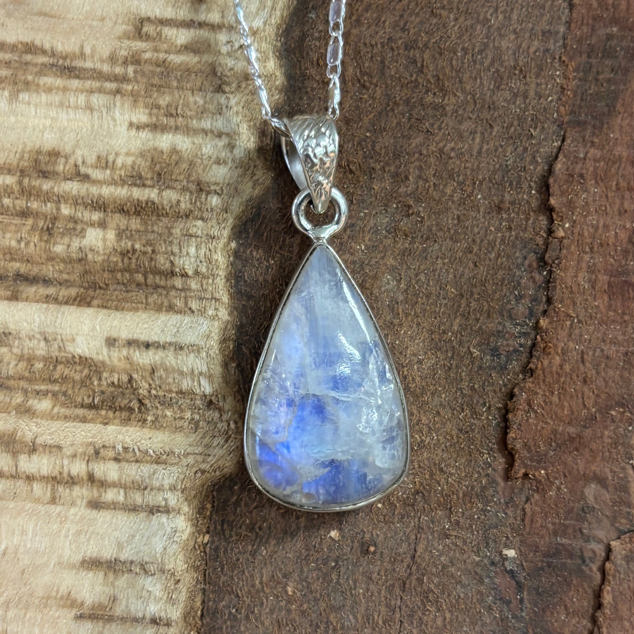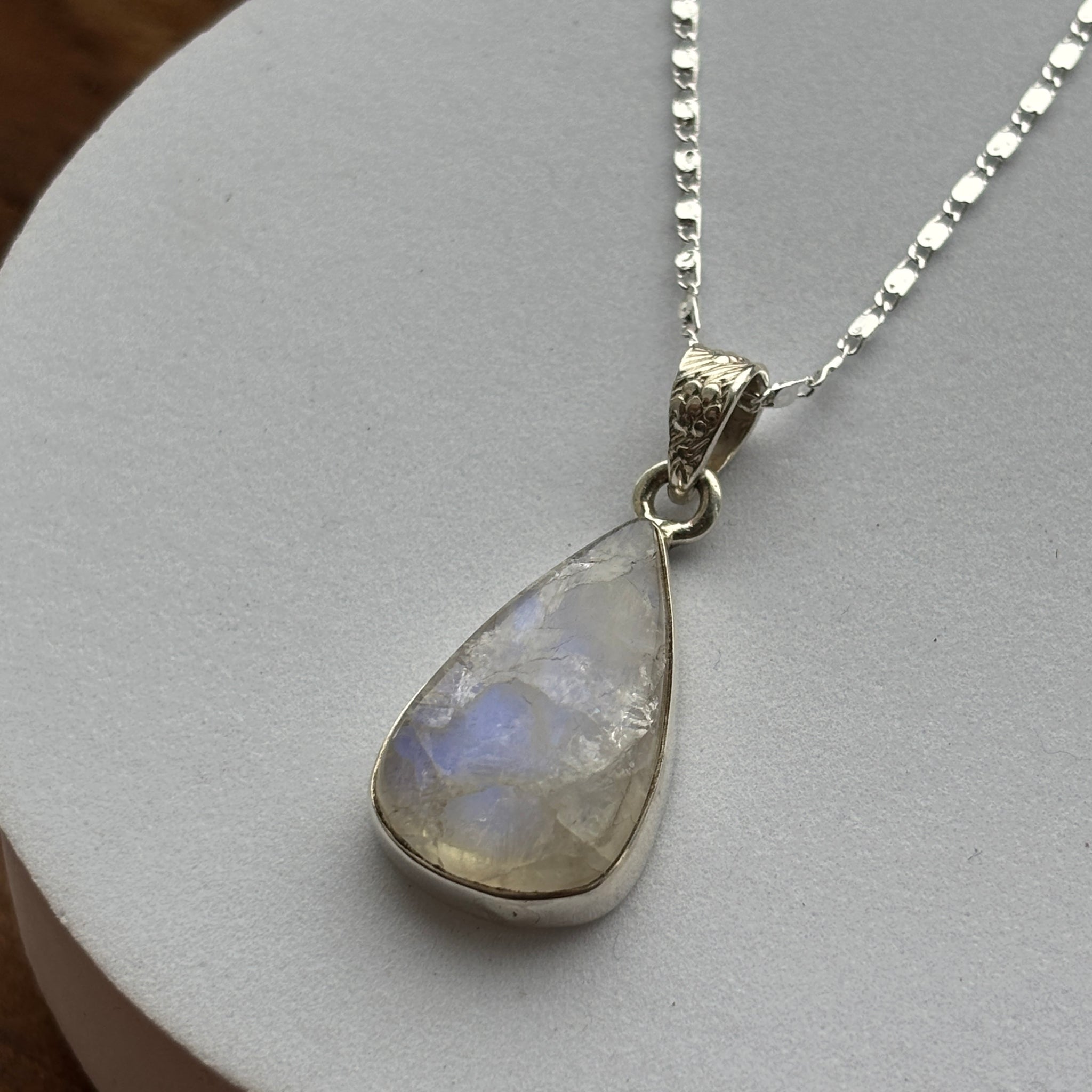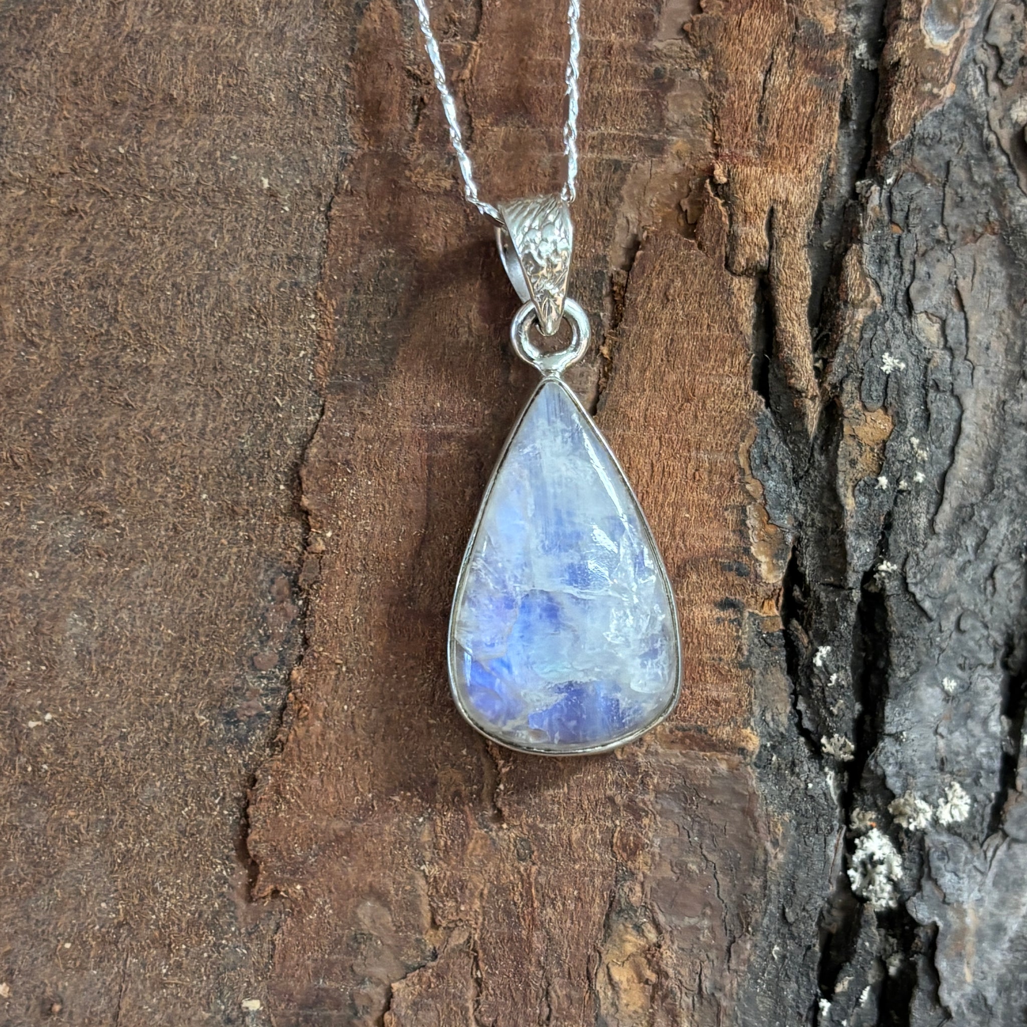 Pendentif pierre de Lune La pierre de lune, scientifiquement appelée orthoclase ou hécatolite, fait partie de la famille des Feldspaths Elle a une teinte transparente à blanche, jusqu’à des reflets...